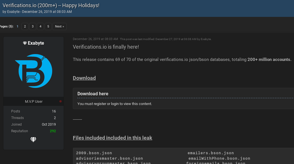 On Oct 12, 2019, a new user named Exabyte registered on RaidForums — a site dedicated to sharing hacked databases and tools to perpetrate credential stuffing attacks. That Exabyte account was registered less than two weeks after Troia created his Exabyte identity on OGUsers. The Exabyte on RaidForums posted on Dec. 26, 2019 that he was providing the community with something of a belated Christmas present: 200 million accounts leaked from Verifications.io.