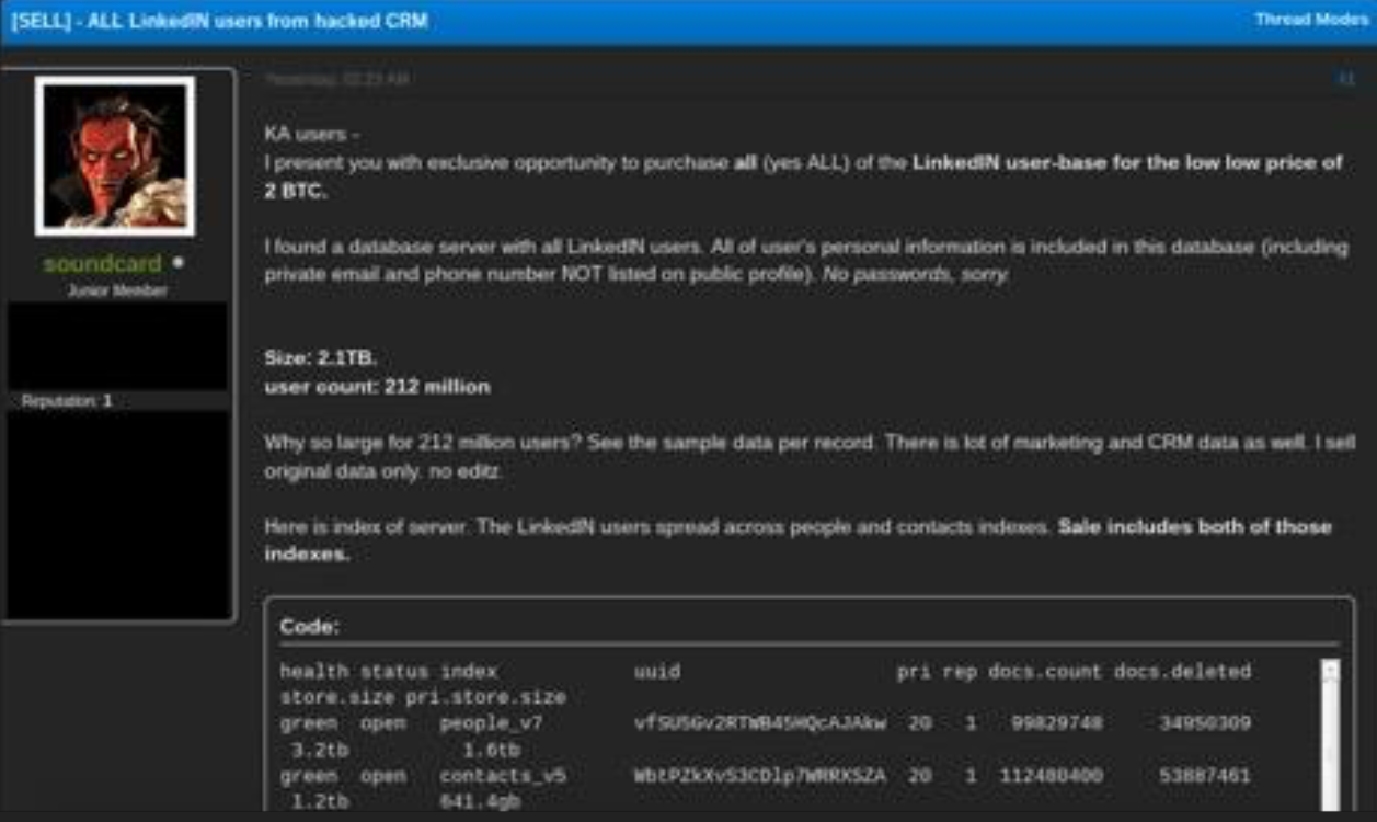 Soundcard, a.k.a. Troia, offering to sell what he claimed was all of LinkedIn’s user data, on the Dark Web forum Kickass.