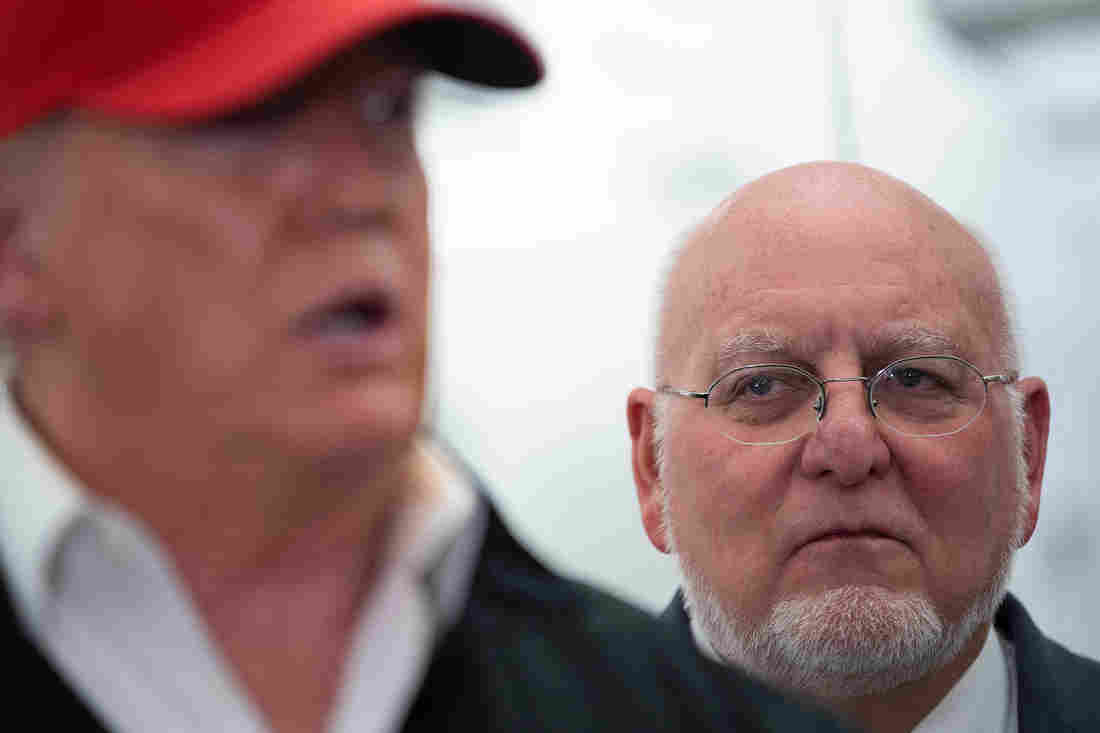 CDC Director Dr. Robert Redfield, right, listens as President Donald Trump speaks during a tour of the CDC in Atlanta on March 6, 2020. Jim Watson/AFP via Getty Images hide caption