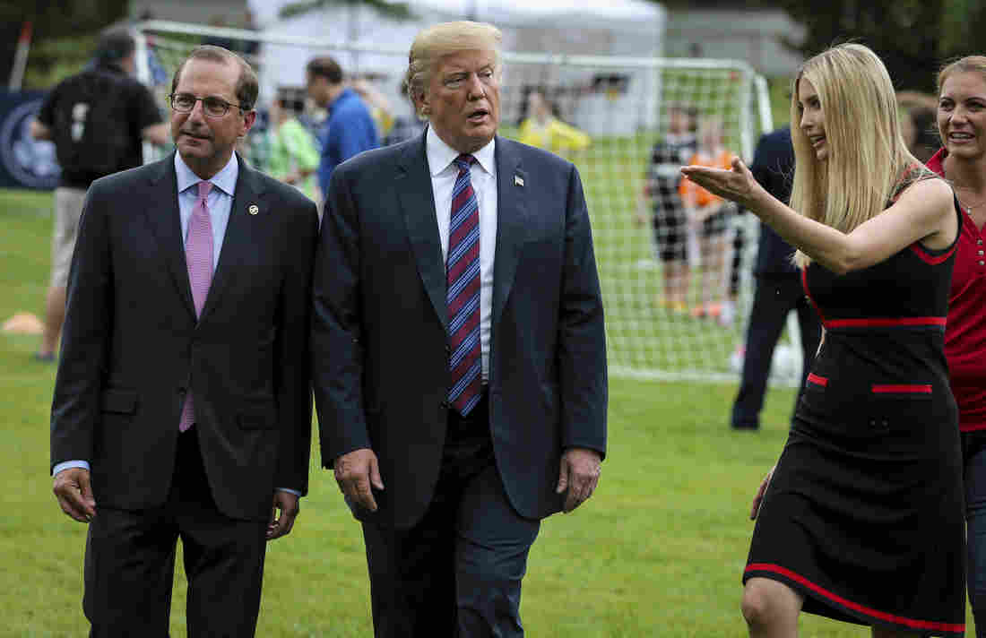 President Donald Trump, center, Health And Human Services Secretary Alex Azar, left, and Ivanka Trump, right, walk together on the South Lawn of the White House on May 30, 2018. Oliver Contreras-Pool/Getty Images hide caption