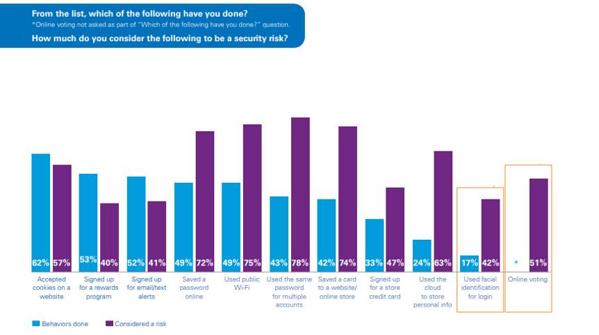Consumers seem to think that online voting is less risky (51%) than accepting cookies on a website (57%), or using the cloud to store personal information (63%). Only 42% of respondents thought that using facial recognition was considered a risk