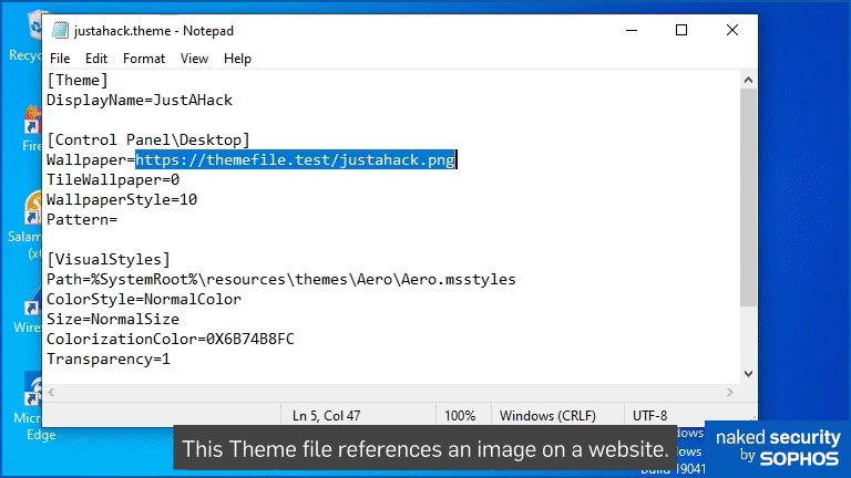 Bohops, however, put his “What if?” cybersecurity research hat on, and wondered what might happen if he used a Theme file to reference images out on the internet, using web URLs instead of regular filenames.