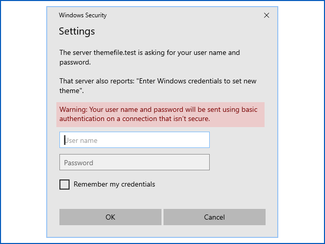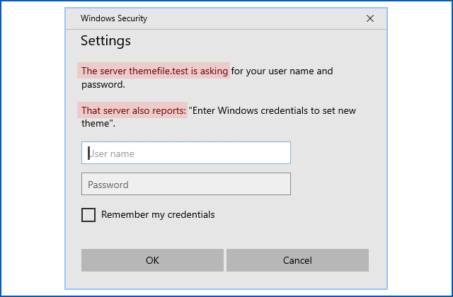 The trick he figured out was simple but surprisingly effective: point the Theme file at a web server you control, configure your website to require authentication, and see if the Windows computer will supply you with a password.