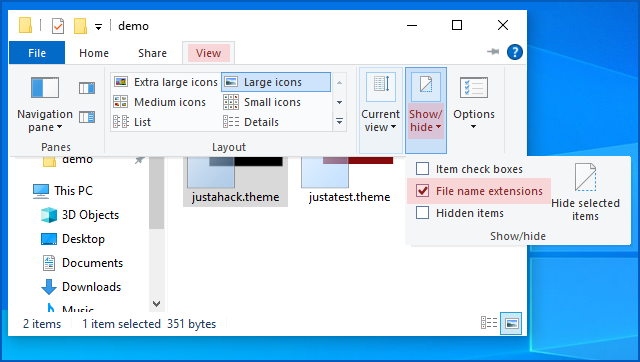 - Turn on the option to show file extensions. In File Explorer, click on the View item in the menu bar and then turn on the option File name extensions. If the Explorer window is narrow you may need to open the Show/hide tab first. Windows uses file extensions to decide how to handle files, and you should too, because the crooks love to use names like