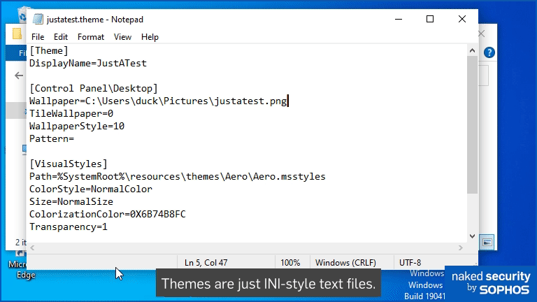 Despite their generally low direct risk, .theme files nevertheless received a public airing in in the notorious “Vault 7” data dump back in 2017, when WikiLeaks exposed a massive trove of confidential documents allegedly stolen from the CIA. Vault 7 included a knowledgebase article, supposedly from the CIA’s Information Operations Centre, remarking that Themes might be handy as a way of amplifying the effect of an existing exploit by allowing multiple variants of the exploit to be delivered in one go: “[I]n the cases where your execution vector uses icon rendering/file previews to exploit (link files, font files), a theme file can allow you to point to up to three other files and render them from one.”